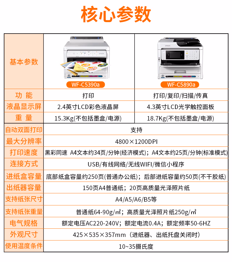 爱普生(EPSON) WF-C5390a C5290a C5790a C5890a A4宽幅彩色不干胶标签打印机 自动双面无线 WF-C5390a自动双面(办公打印+不干胶打印)